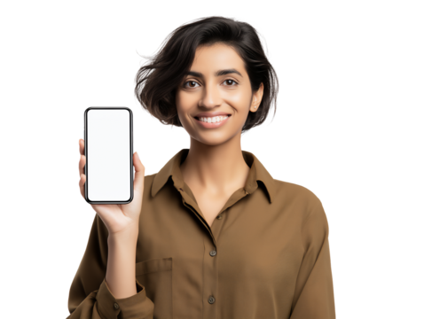 Smiling and happy Indian Asian woman holding blank smartphone mock up, isolated on white or transparent background