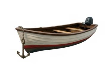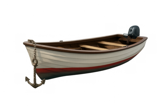 Vintage wooden fishing vessel featuring outboard motor, anchored, floating against transparent backdrop for maritime design needs