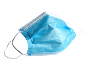 A blue, disposable medical face covering against a black background