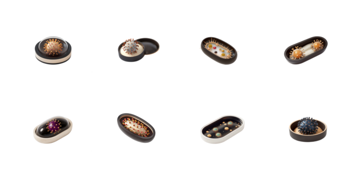 Collection of stylized virus particles resembling coronavirus displayed within various laboratory petri dishes and containers on transparent background