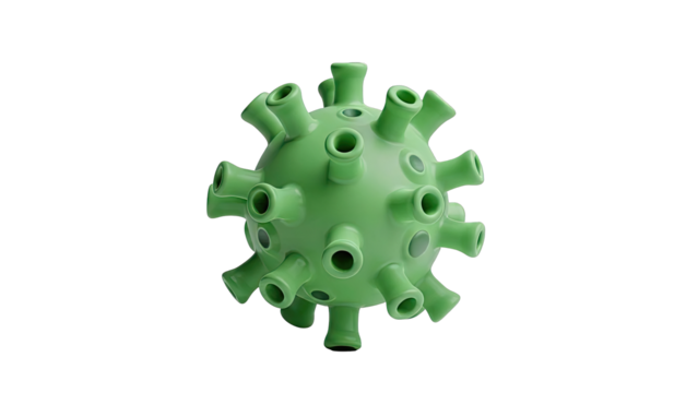 Artistic top-down illustration of a spherical virus, showcasing spikes, color gradients, and internal structure