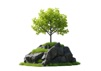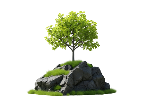 Lush green tree atop a rocky outcrop against a dark background.
