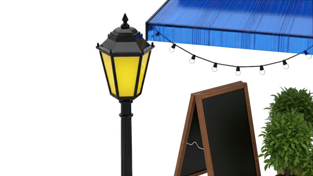 Street Lamp, Awning, Lights, Sandwich Board, and Plant