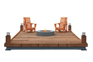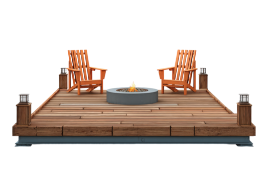 Two Wooden Adirondack Chairs and a Fire Pit on a Deck.