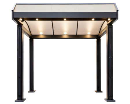 Modern outdoor gazebo with a hardtop roof and built-in lights on a transparent background