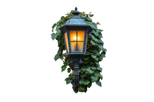 A vintage wall lantern glowing warmly, surrounded by lush green leaves and vines, isolated on a transparent background