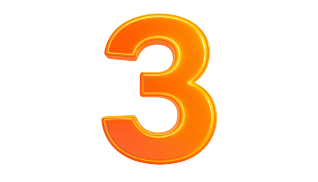 A vibrant, orange-hued, 3D rendered numeral three, isolated against a solid black background. The digit has a highlighted outer edge