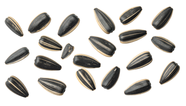 A close-up shot of a scattering of seeds showcasing their striped patterns and dark outer shell against a stark background