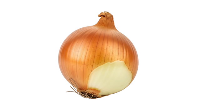 A close-up of a single onion, fresh and ready for culinary use. The onion's outer layers are a warm, papery brown, contrasting with its crisp, white flesh.