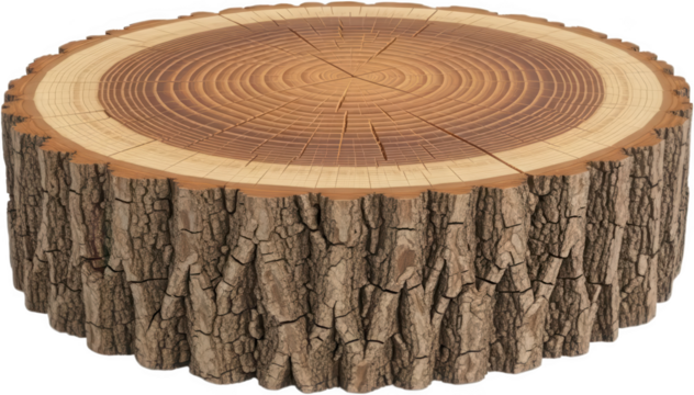 Realistic cross section of a thick tree stump showing detailed annual growth rings and rough outer bark texture wood slice tree trunk timber natural brown organic transparent background