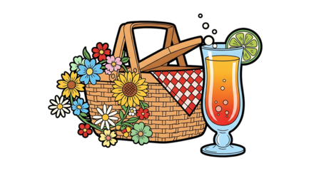 Vibrant picnic scene featuring a basket, flowers, and refreshing tropical drink