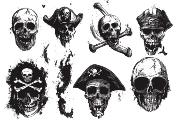 Pirate skull collection featuring grunge designs in halftone style that captures the adventurous spirit of the high seas and the mystery of pirate lore