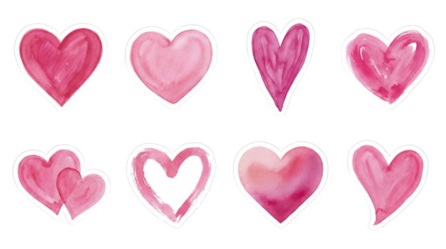 Pink watercolor heart set including solid, outlined, tall, and layered shapes isolated. Romantic decorative elements for valentines day and wedding stationery.