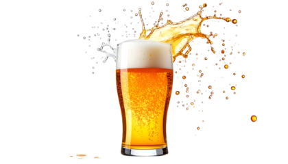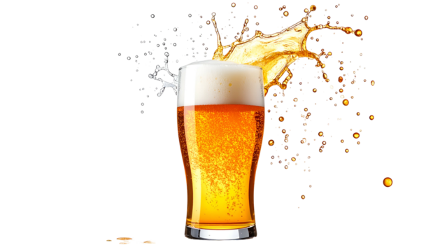 A pint glass overflowing with golden beer and foam, captured mid-splash