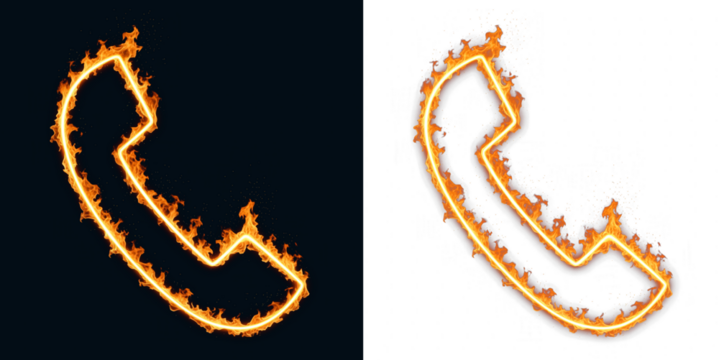 Telephone handset icon outlined with fire showing call and hotline access, graphic element for contact buttons in apps and help line signage, telecom emergency communication prompts on screen