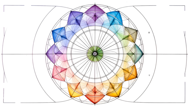 A vibrant, geometric illustration showcasing a multi-colored floral wheel design. Radiating petals form a circle, outlined