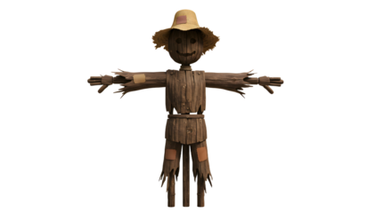 Creepy burlap scarecrow puppet with stitched face and outstretched arms hangs eerily, perfect for Halloween and horror themes
