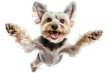 Happy yorkshire terrier dog jumping with arms outstretched isolated on transparent background.