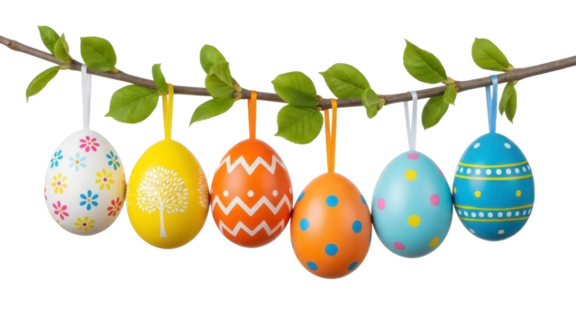 Easter Eggs with Floral and Geometric Decorations on Branch PNG