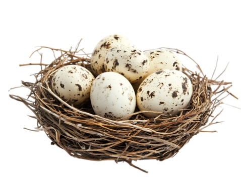 Small speckled bird eggs nestled in a natural twig nest isolated on transparent background