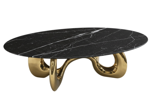 Modern oval black marble coffee table with gold abstract base isolated on transparent background