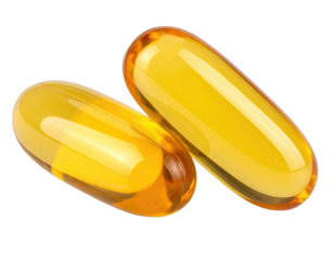 Close-up of three yellow, oval-shaped soft gel capsules arranged against a black backdrop