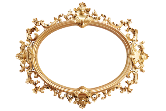Antique baroque gold wooden oval picture frame isolated on transparent background. Decorative elegant luxury frame design, rococo style. PNG, cutout.
