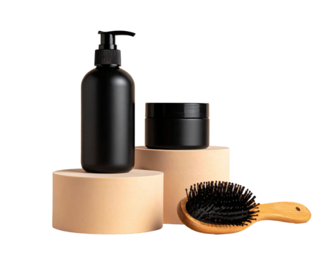 Matte black cosmetic bottles and a wooden hairbrush sit on beige risers against a black background.  A pump bottle, a jar, and a round brush are displayed