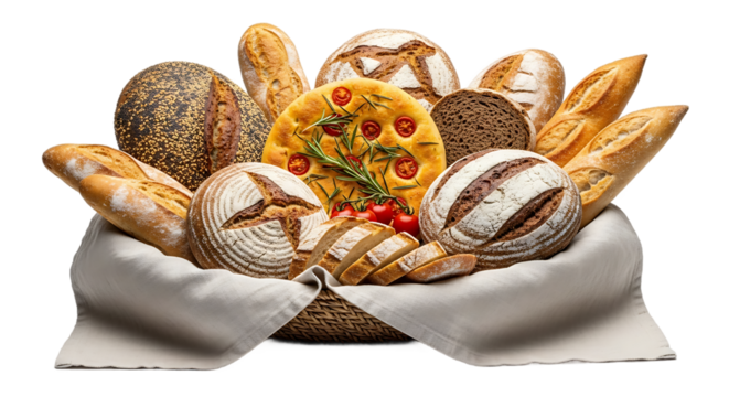 Artisan bread basket overflowing with fresh, golden-crusted loaves, baguettes, and focaccia topped with tomatoes and rosemary, perfect for bakery, culinary, or gourmet food marketing.