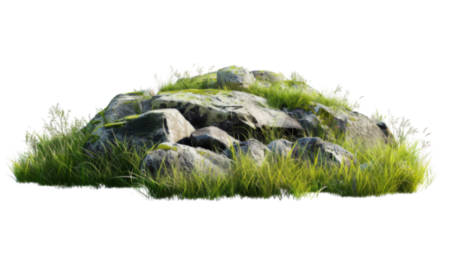 Beautiful of Large rocks with overgrown foliage and moss, plants and foliage around isolated on a transparent background.