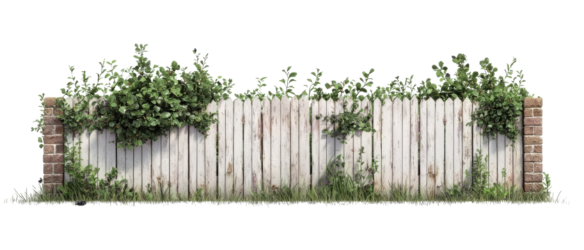 Rustic weathered wooden picket fence covered with ivy and foliage on a transparent background. Old overgrown wooden fence PNG.