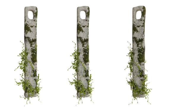 Three weathered stone pillars adorned with overgrown foliage