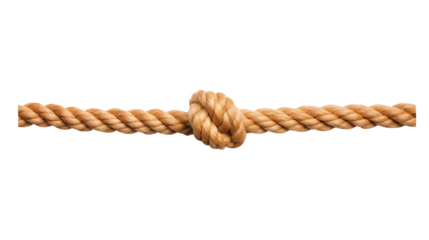 A thick rope tied into a strong overhand knot with visible fibers and tension, isolated on a transparent background