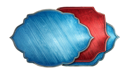 Set of Two Overlapping Ornate Scratched Metal Plaques in Blue and Red Isolated