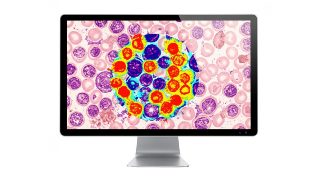 Computer screen displays AIenhanced blood smear with colorful heatmap overlay highlighting abnormal cells on a clean white background emphasizing advanced diagnostic technology.