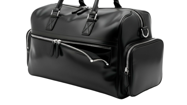 Elegant black leather duffel bag with sturdy handles and a sleek design on transparent background.