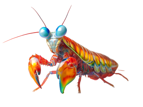 Vibrantly colored shrimp with oversized eyes and claws, set against a transparent background, showcasing its intricate anatomy