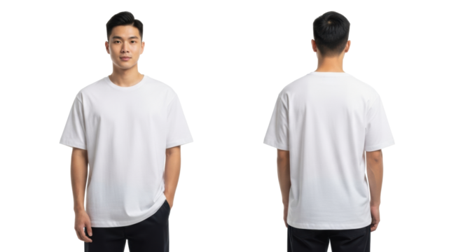 Young asian man in oversized white t-shirt & dark chinos, side-by-side front & back views on white studio background with copy space, soft lighting, apparel mockup concept for product display
