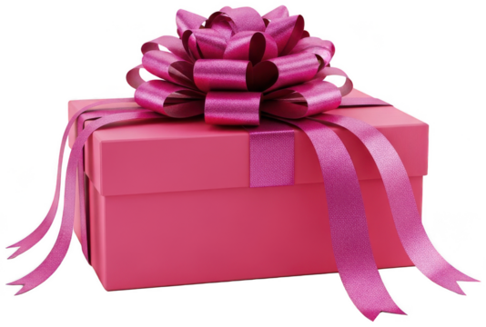 Pink gift box with large sparkly magenta ribbon and decorative bow