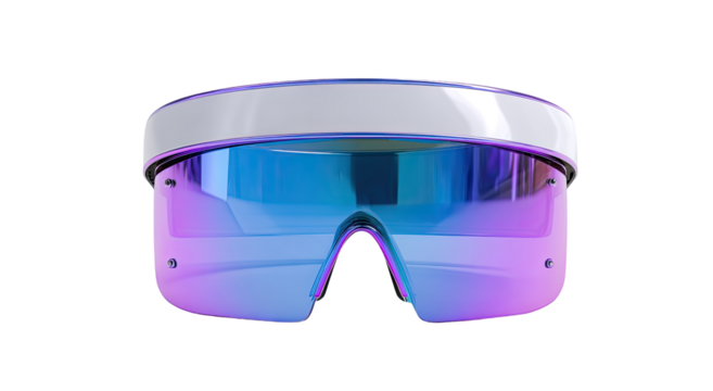 Futuristic, oversized sunglasses with a white headband.  Colorful, iridescent lenses create a vibrant, eye-catching effect.  3D rendered, isolated, and presented in a frontal view