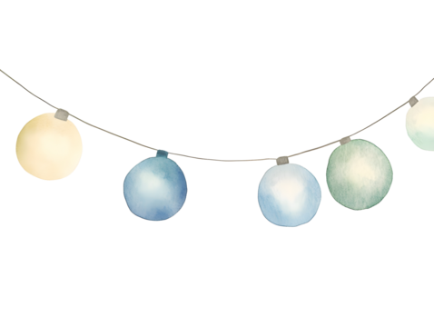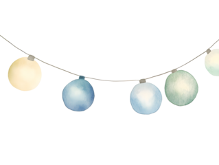A watercolor illustration of a chunky string of fairy lights with oversized pastel blue and green bulbs watercolor texture 4K clipart muted pastel colors simple bold shapes isolated o