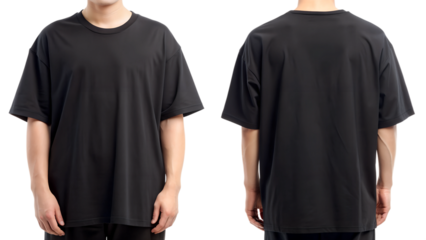 Two meticulously flattened black oversized t-shirts, front and back views, side-by-side on a seamless transparent background with ample negative space, concept for apparel product mockup
