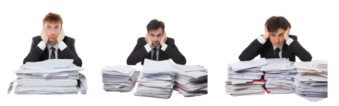 Businessman stressed by a lot of work, png background, white background, Generative Ai