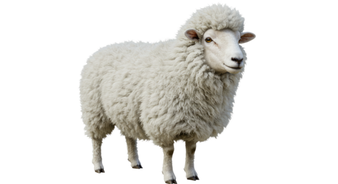 A full-body studio portrait of a sheep with thick wool against a white background, cut out transparent