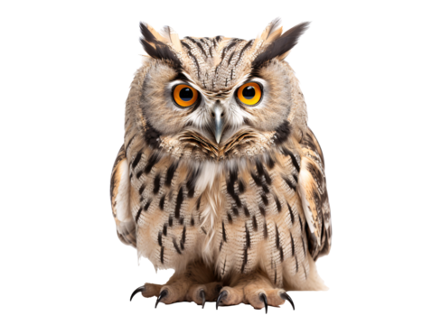 Majestic Eurasian eagle owl with piercing orange eyes isolated on transparent background, detailed wildlife close-up for nature, animal, and educational projects