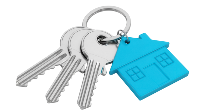 House keys with blue house keychain isolated PNG, real estate concept for home ownership and property investment on transparent background