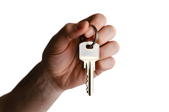 Hand holding a single key, ready for new beginnings  . Isolated on transparent background, png