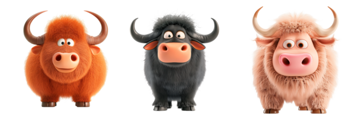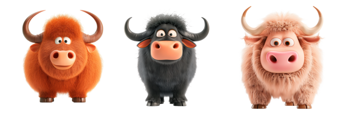 set of three cute buffalos/bulls cartoon isolated transparent background