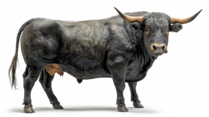 Full side view of a black bull with large horns isolated on white background.