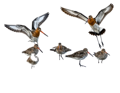 Several wading birds showcase elegant forms and striking plumage. Some are airborne, their wings outstretched, while others stand